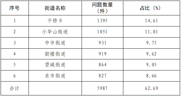 多发区域主要集中在平桥乡、小华山街道、中市街道、鼓楼街道、望城街道、东市街道,共计采集问题5987件,占问题总数的62.69%。详细数据见下表: