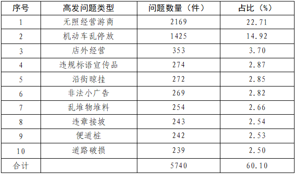 高发问题前十小类分别是无照经营游商、机动车乱停放、店外经营、违规标语宣传品、沿街晾挂、非法小广告、乱堆物堆料、违章接坡、便道桩、道路破损,共计采集问题5740件,占问题总数的60.10%。详细数据见下表: