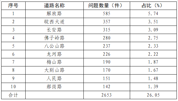 多发路段主要集中在解放路、皖西大道、长安路、佛子岭路、八公山路、龙河路、梅山路、大别山路、人民路、郝岗路,共计采集问题2653件,占问题总数的26.05%。详细数据见下表: