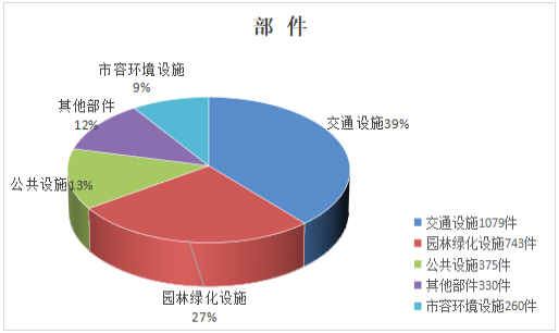 部件类问题2787件,占问题总数46.33%。其中:交通设施类1079件,占部件类总数39%;园林绿化设施类743件,占部件类总数27%;公共设施类375件,占部件类总数13%;市容环境设施类260件,占部件类总数9%;其他部件类330件,占部件类总数12%。