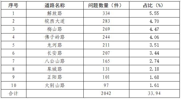 多发路段主要集中在解放路、皖西大道、梅山路、佛子岭路、龙河路、长安路、八公山路、皋城路、正阳路、大别山路,共计采集问题2042件,占问题总数的33.94%。详细数据见下表: