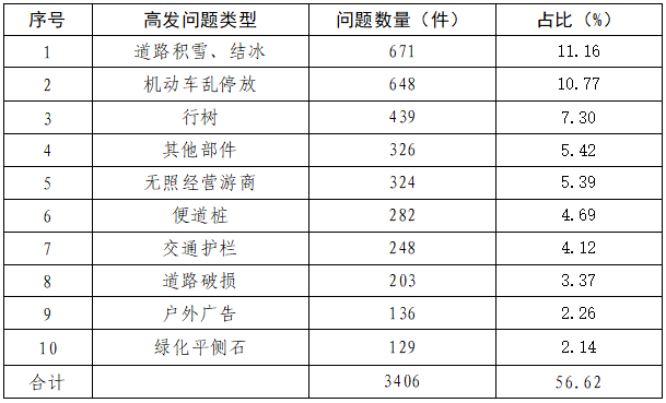 高发问题前十小类分别是道路积雪结冰、机动车乱停放、行树、其他部件、无照经营游商、便道桩、交通护栏、道路破损、户外广告、绿化平侧石,共计采集问题3406件,占问题总数的56.62%。详细数据见下表: