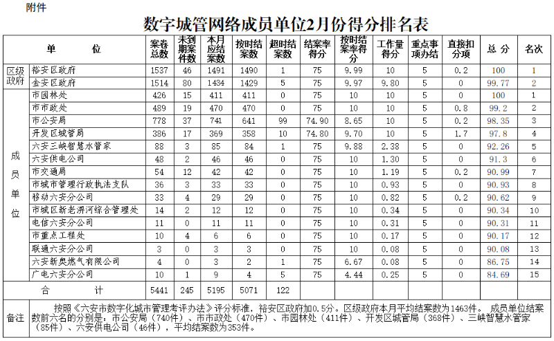 依据《六安市数字化城市管理考评办法》,现将各网络成员单位2月份数字城管系统案件办理和考评得分情况通报如下: