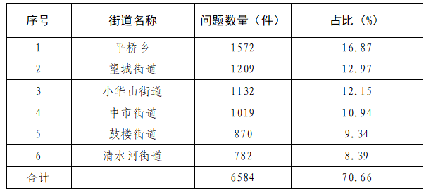 多发区域主要集中在平桥乡、望城街道、小华山街道、中市街道、鼓楼街道、清水河街道,共计采集问题6584件,占问题总数的70.66%。详细数据见下表: