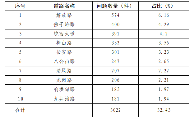 多发路段主要集中在解放路、佛子岭路、皖西大道、梅山路、长安路、八公山路、清风路、龙河路、响洪甸路、龙井沟路,共计采集问题3022件,占问题总数的32.43%。详细数据见下表: