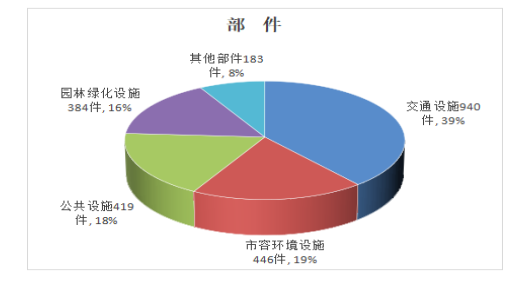 部件类问题2372件,占问题总数25.46%。其中:交通设施类940件,占部件类总数39%;市容环境设施类446件,占部件类总数19%;公共设施类419件,占部件类总数18%;园林绿化设施类384件,占部件类总数16%;其他部件类183件,占部件类总数8%。