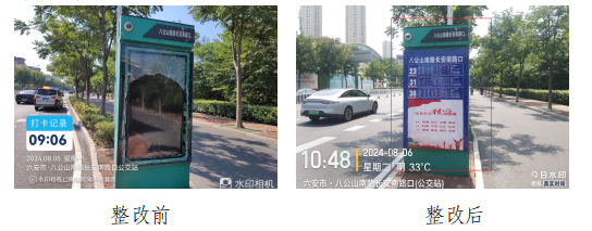部件损坏修复不及时:如梅山南路与天河东路交口西南角,春江公寓公交站亭显示屏缺亮;周集路与梅山北路交口东南角路面塌陷。