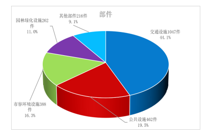 部件类问题2375件,占问题总数24.73%。其中:交通设施类1047件,占部件类总数44.1%;公共设施类462件,占部件类总数19.5%;市容环境设施类388件,占部件类总数16.3%;园林绿化设施类262件,占部件类总数11.0%;其他部件类216件,占部件类总数9.1%。