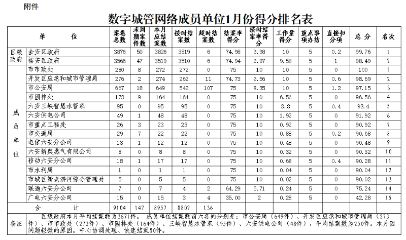根据市委、市政府的要求,依据《六安市数字化城市管理考评办法》(六政办〔2015〕93号),现将各网络成员单位1月份数字城管系统问题办理和考评得分情况通报如下:
