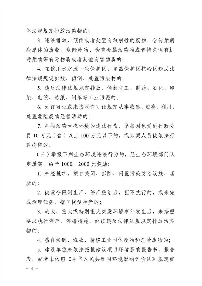 (三)举报下列生态环境违法行为的,经市级生态环境部门认定属实,给予1000—2000元奖励: