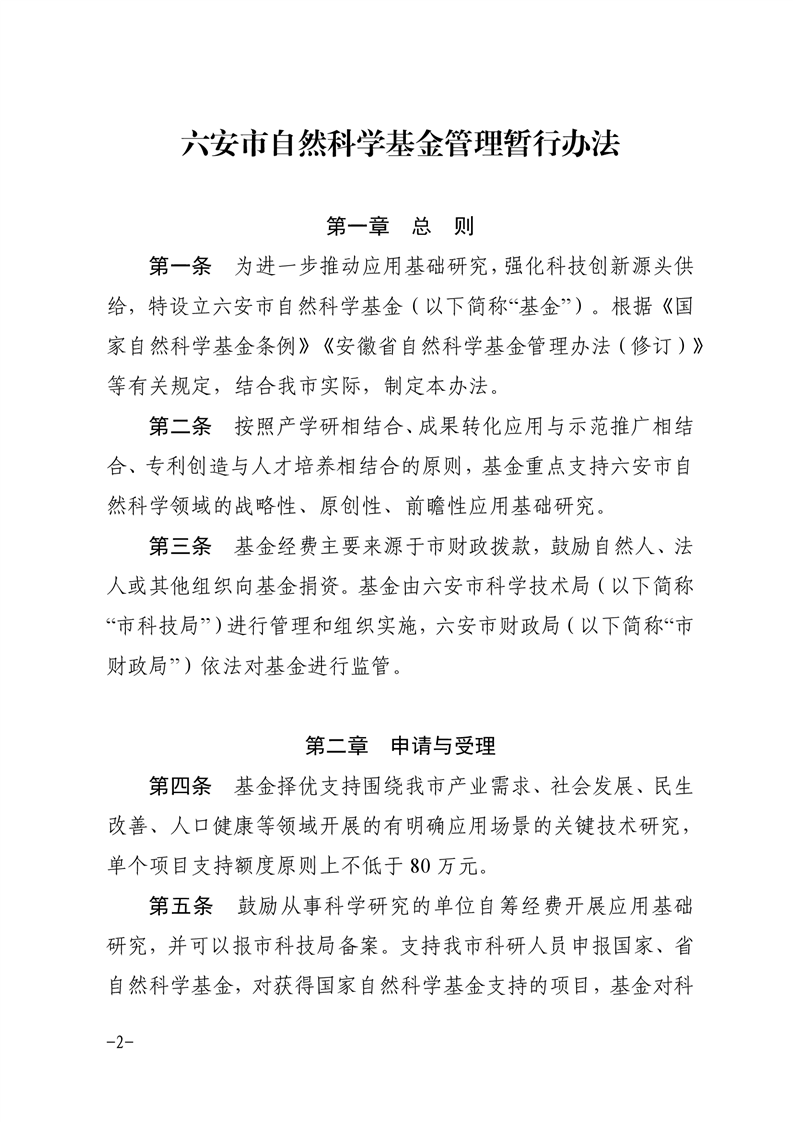 1.总则。明确了市自然科学基金的设立依据、面向主体和经费来源。根据《国家自然科学基金条例》《安徽省自然科学基金管理办法》等有关规定制订该办法,基金主要面向六安市域内高等院校、科研机构和医疗卫生机构等从事科学研究的法人单位科研人员,重点支持自然科学领域战略性、原创性、前瞻性的应用基础研究。
