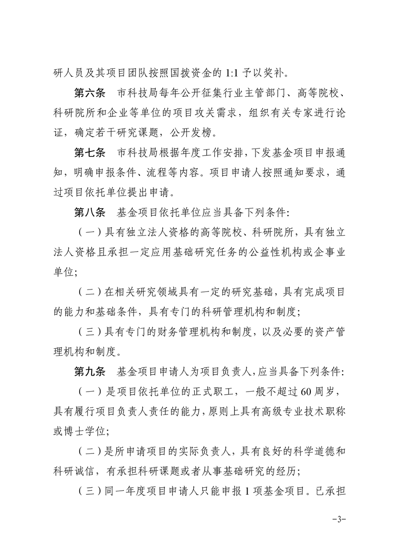 2.申请与受理。明确了市自然科学基金的支持重点和额度、申报流程、项目依托单位条件、项目申请人条件和立项方式。基金择优支持围绕我市产业需求、社会发展、民生改善、人口健康等领域开展的有明确应用场景的前瞻性、引领性、原创性关键技术研究,单个项目支持额度原则上不低于80万元。对获得国家自然科学基金支持的项目,基金对科研人员所在单位按照国拨资金的50%予以奖励。基金项目综合采取揭榜挂帅、联合攻关等方式立项,形成多元化攻关机制。鼓励项目依托单位和行业领军企业、市外科研单位等主体联合开展项目攻关。