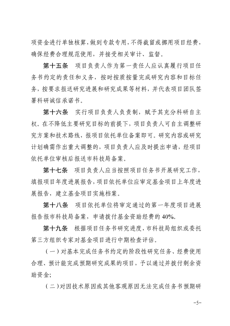 3.实施与管理。明确了市自然科学基金的立项实施流程、项目依托单位责任和义务、项目负责人责任和义务、项目过程管理、项目执行期、项目验收要求、项目研究成果等规定。项目依托单位应做好本单位基金项目的监督、管理,项目负责人作为第一责任人应认真履行任务书约定的责任和义务,基金项目的执行期一般不超过三年。基金项目验收以任务书约定的研究目标和考核指标为依据,由市科技局统一组织或委托第三方组织专家进行评审验收。赋予项目依托单位和项目负责人项目资金管理使用权,项目经费管理试行“包干制”。