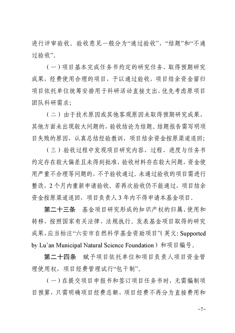 第十九条 基金项目的研究成果,包括专著、论文、软件、数据库、专利以及成果报道等,均应标注“六安市自然科学基金资助项目”(英文:Supported by Luan Municipal Natural Science Foundation)和项目编号。项目研究成果管理按照国家有关规定执行,项目研究形成的知识产权的归属、使用和转移,按照国家有关法律、法规执行。
