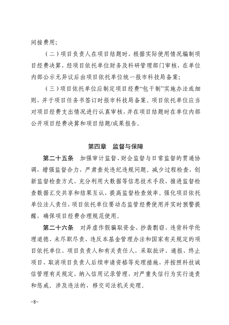 4.监督与保障。明确了市科技局会同市财政局等部门对基金项目有计划、有重点的进行监督。加强审计监督、财会监督与日常监督的贯通协调,增强监督合力,严肃查处违纪违规问题。