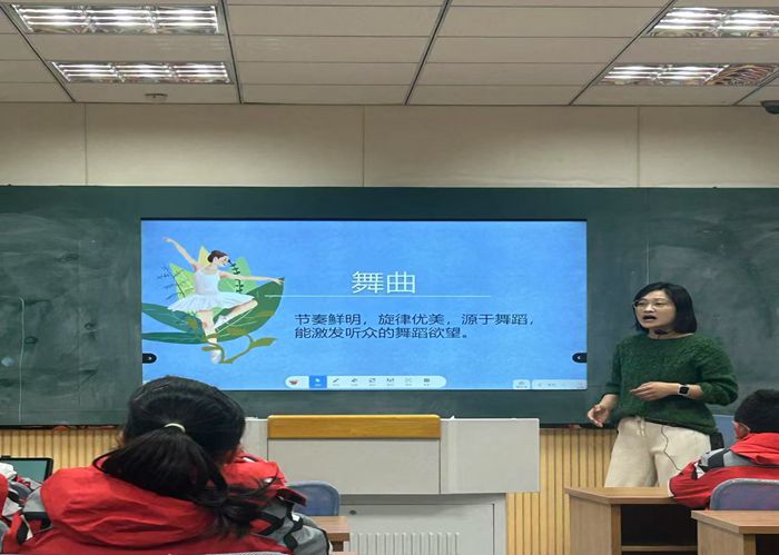 活动上,王甜甜老师依托《那不勒斯舞曲》教学课例,通过数字技术与音乐艺术的创新结合,展现了“双减”背景下高效课堂的生动实践。她借助多媒体设备播放《四小天鹅舞曲》视频,辅以舞剧《天鹅湖》的沉浸式场景图片,迅速点燃学生兴趣,以“轻负高效”的方式引导学生进入音乐情境。在赏析《那不勒斯舞曲》环节,她通过平板电脑展示动态图形谱,学生触屏标注音乐力度、速度变化,直观对比A段(抒情)与B段(热烈)的差异,精准突破单二部曲式结构的教学难点,充分体现智慧课堂“以学为本”的高效性。