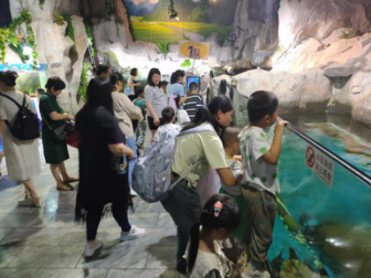 在海洋馆青少年们观看各种海洋生物,在讲解员的引导下,了解海洋生物的分类,不同海洋生物的生活习性,观看了海豹表演、潜水员与鳐鱼的互动等节目。