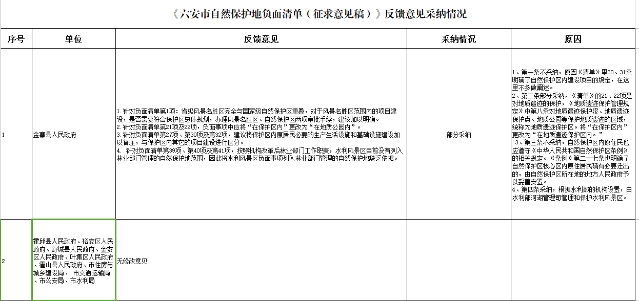 《六安市自然保护地负面清单(征求意见稿)》,于2021年6月1日至6月30日期间面向社会公开征求意见,通过电话、电子邮箱、书面信件等方式向社会征集相关意见和建议,未收到社会公众反馈意见,有关单位反馈4条意见。