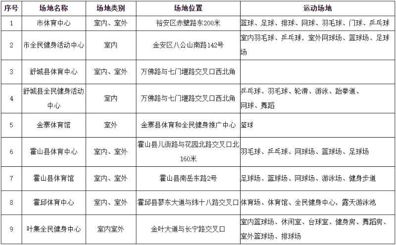 六安全市公共体育场馆向社会免费或低收费开放名单