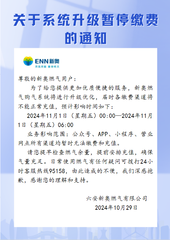 关于六安新奥燃气系统升级暂停缴费的通知