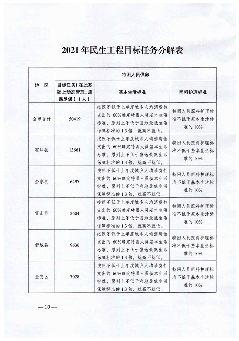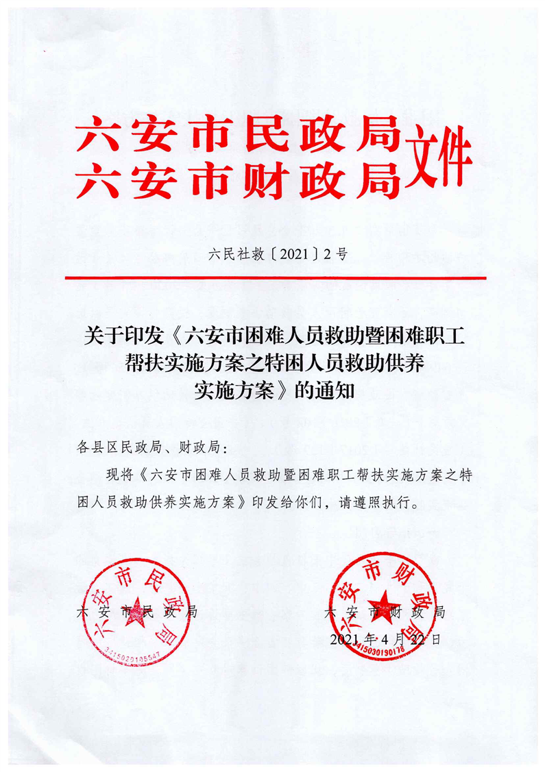 关于印发《六安市困难人员救助暨困难职工帮扶实施方案之特困人员救助供养实施方案》的通知
