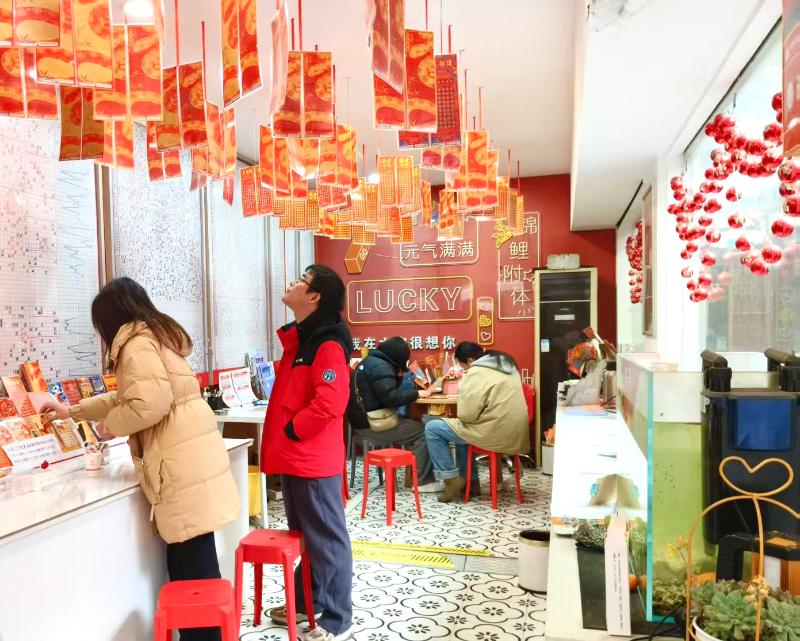 “福运翻番,彩耀新春,福彩刮刮乐好礼来咯!刮蛇年福彩生肖票,兑奖加赠刮刮乐至高200元好礼……!”一大早,安徽福彩定制的蛇年生肖票音频就在六安市红街上回响,为浓厚的年味增添了几分幸运的味道。播放音频的正是位于红街的34130181号销售网点。作为福彩体验店,宽敞明亮的空间让人眼前一亮。店内,茶水热气腾腾、微波炉随时待命、雨伞整齐摆放、老花镜安静待取,各类便民用品一应俱全,每一处细节都彰显着贴心与关怀。站主夫妻俩还独具匠心,亲手用刮刮乐彩票精心制作了一系列春节挂件,为店铺增添了别样的节日氛围。茶几上,花生、瓜子和糖果满满当当,仿佛在热情邀请每一位进店的顾客,坐下来歇歇脚、试试手气。柜台上,一张张中奖的刮刮乐彩票在灯光下熠熠生辉,见证了春节期间的欢乐与幸运。