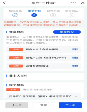 5.根据提示信息上传对应材料。对材料信息进行检查无误后,点击【下一步】按钮进入材料收取页面。