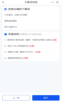 3.选择情形之后,点击下方的【确定】按钮,此时页面会弹出需要办理的事项列表与需要上传的材料信息,点击【确定】按钮进入填写表单页面。
