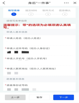 4.进入填写表单页面,根据页面提示补充相关的信息。注意:带*的选项为必填项,请认真填写。填写完成之后,点击【下一步】按钮进入提交材料页面。