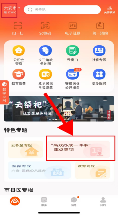 皖事通端口:1.打开并登录皖事通APP,左上角城市选择“六安市”,在首页“特色专区”下点击“高效办成一件事”,在个人事项中找到“身后一件事”,点击进入。