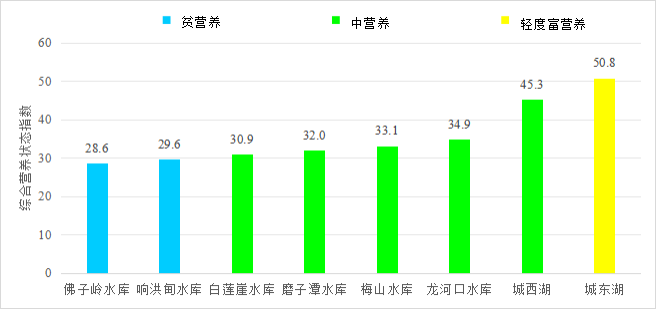 全市监测的8个湖库中,水质为优的6个,占75.0%;水质为轻度污染的2个,占25.0%。监测营养状态的8个湖库中,贫营养状态的2个,占25.0%,中营养状态的5个,占62.5%,轻度富营养状态的1个,占12.5%。