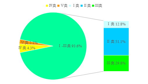 12月,全市地表水总体水质状况为优,监测的47个断面中,Ⅰ~Ⅲ类、Ⅳ类~Ⅴ类水质断面比例分别为93.6%(44个)、6.4%(3个)。