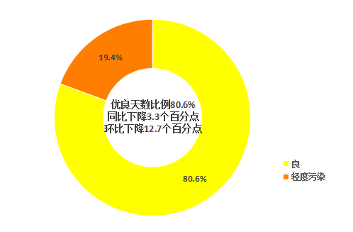 与上月相比,空气质量优良天数比例下降12.7个百分点;与上年同期相比,空气质量优良天数比例下降3.3个百分点。
