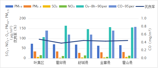 4月份,六安市各县区空气质量优良率范围为76.7%(霍邱县)~96.3%(叶集区),平均优良率为87.9%。