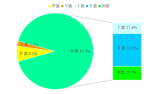 全市河流总体水质状况为优,监测的38个断面中,Ⅰ~Ⅲ类水质断面比例为92.1%(35个),Ⅳ~Ⅴ类 7.9%(3个)。