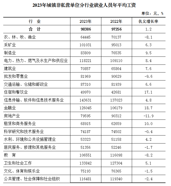 2023年,全市城镇非私营单位就业人员年平均工资98386元,比上年增加1130元,名义增长1.2%。其中,在岗职工年平均工资100233元,比上年增加817元,同比增长0.8%。