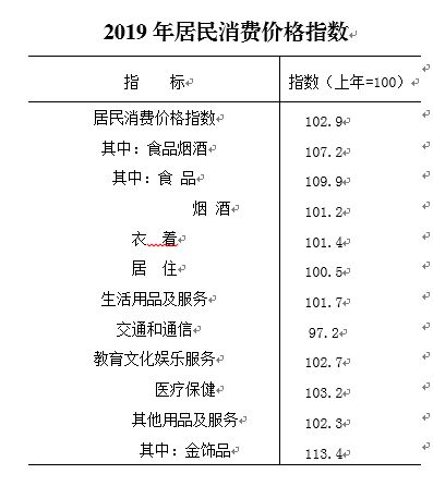 2019年,居民消费价格指数为102.9%,居民消费价格比上年上涨2.9%。其中,医疗保健类价格上涨3.2%,食品类价格上涨9.9%,居住类价格上涨0.5%。工业生产者购进价格指数97.6%;工业生产者出厂价格指数103.5%。
