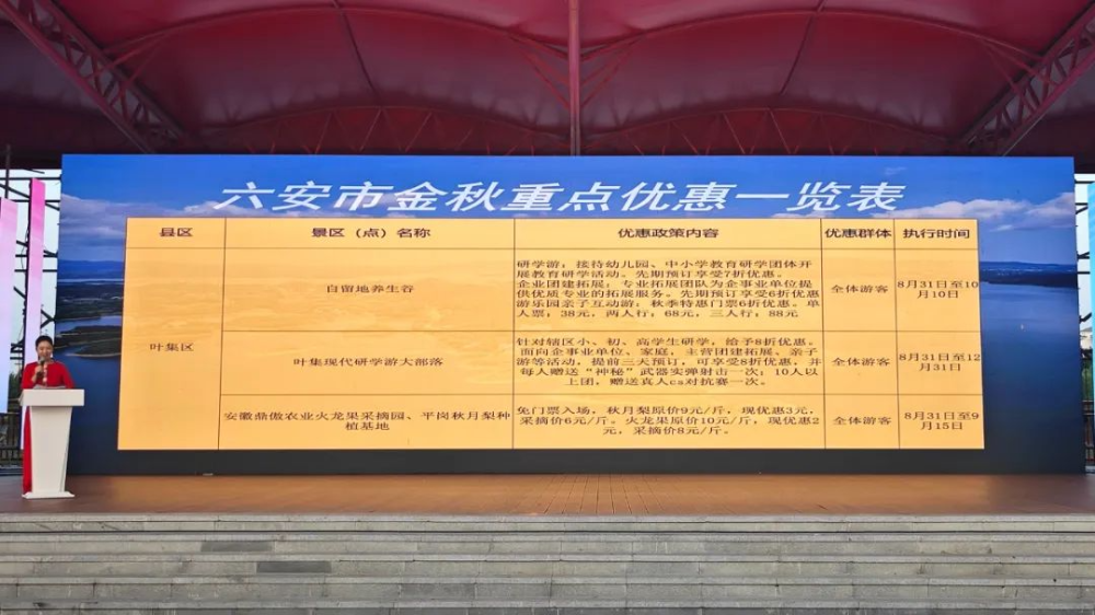 启动仪式上,六安市旅游推荐官向广大市民和游客发布了六安市金秋文旅促消费活动与优惠政策,并倾情推荐了大别山登高赏秋等一系列特色旅游产品,邀请大家走进五彩斑斓的金秋六安。叶集区文旅推介官向大家重点介绍了叶集区金秋文旅消费季系列活动和旅游线路。