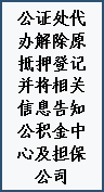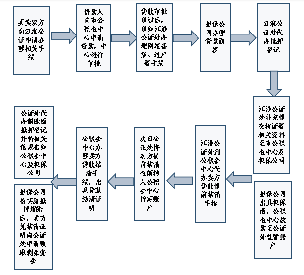 (五)原贷款结清。市公积金中心收到资金后,按照约定办理卖方公积金贷款结清。资金监管方(江淮公证处)办理解除原抵押登记,经担保公司确定抵押权属后,卖方凭结清证明向江淮公证处申请支取剩余资金。