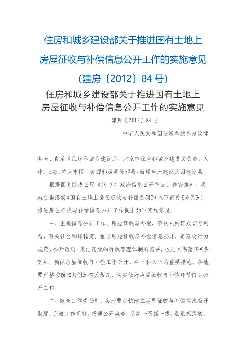 关于推进国有土地上房屋征收与补偿信息公开工作的实施意见