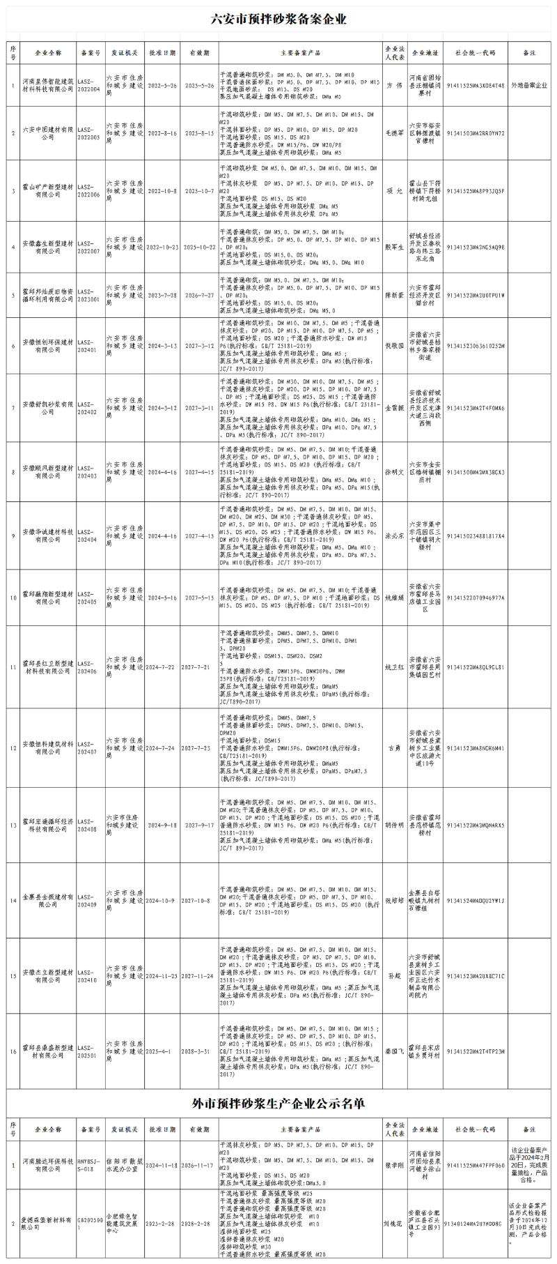 六安市住房和城乡建设局2025年4月其他权力结果(预拌砂浆生产企业备案)