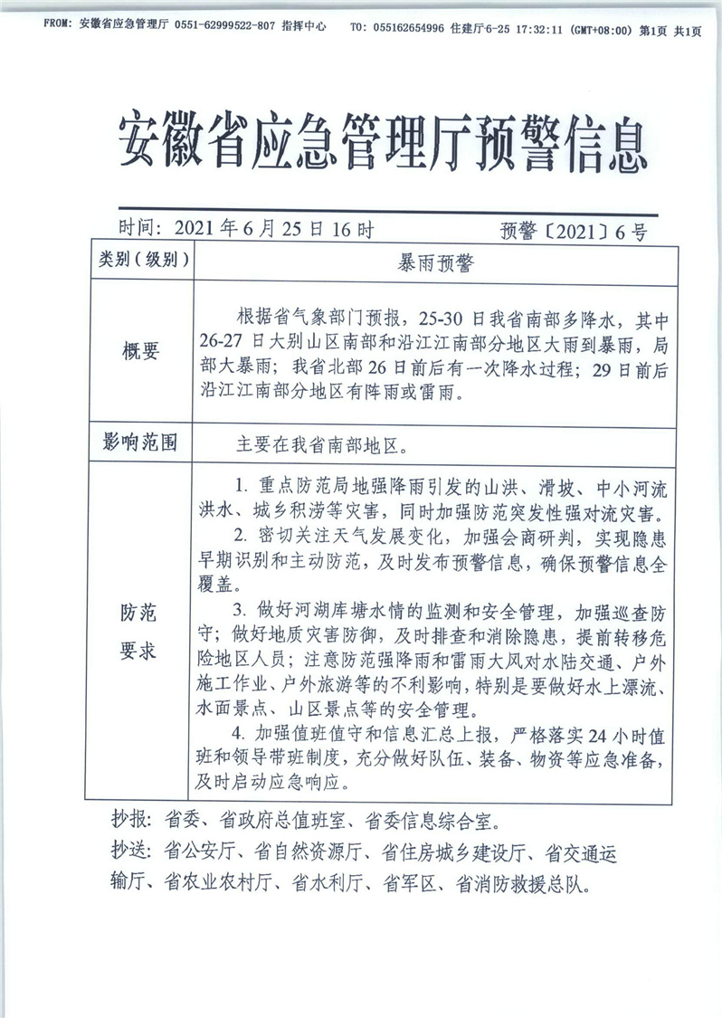 安徽省应急管理厅预警信息