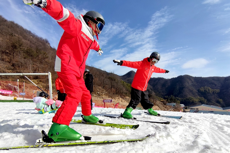 近日,霍山县漫水河镇新铺沟村大别山滑雪旅游度假区,游客在体验滑雪运动的乐趣。