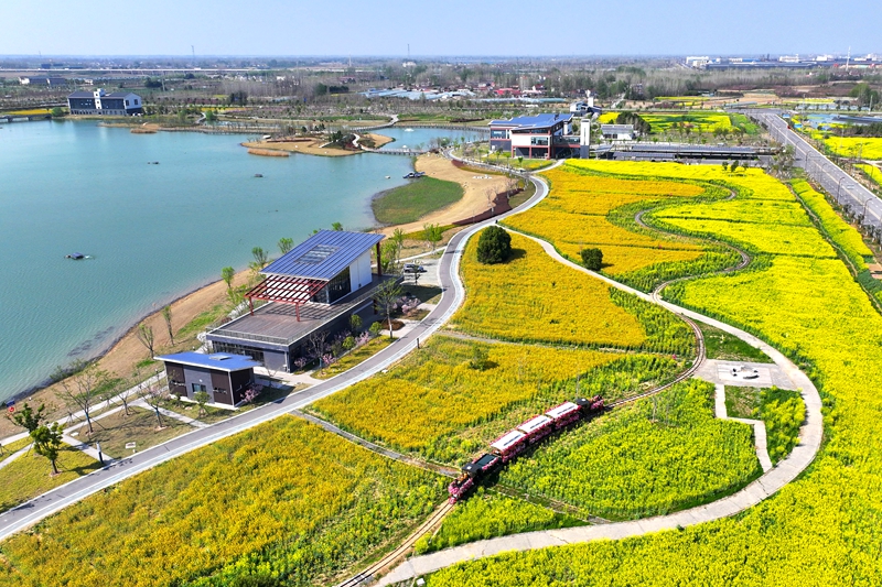 3月26日,金安区城北镇王湾村,一列观光小火车徜徉在油菜花田里,与村庄、景观湖、亲水栈道等相映成景。