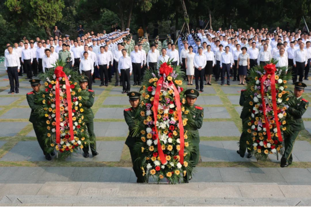 伴随着《献花曲》激昂深情的旋律,10名礼兵抬起花篮,迈着端正、有力的步伐缓缓走向烈士纪念碑,将花篮摆放到纪念碑基座上,全体人员行注目礼。市委副书记、市长叶露中缓步登上纪念碑基座,仔细整理花篮缎带,并和全场人员共同瞻仰烈士纪念碑,表达对英雄先烈的深切缅怀。参加敬献花篮仪式人员依次缓步绕行,瞻仰烈士纪念碑。